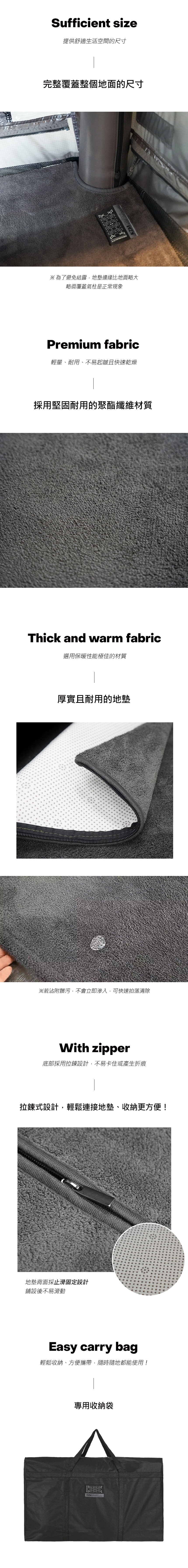 聚酯纖維材質,具備生活防水功能 拉鍊式連接地墊設計 背面止滑固定設計,不易滑動 附專用收納袋