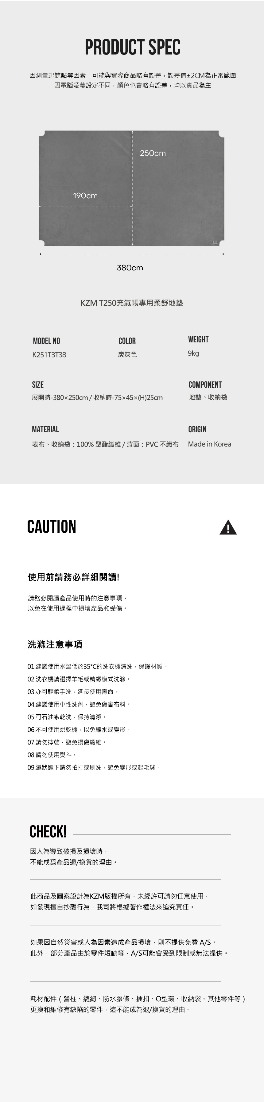 尺寸: 展開時-380×250cm 收納時-75×45×(H)25cm